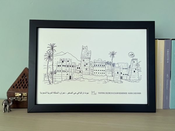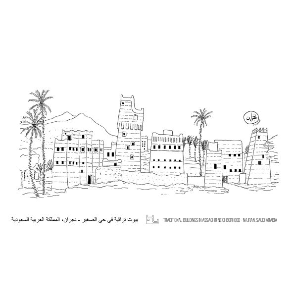 Print of a sketch of the mud buildings of the AsSaghir neighborhood in Najran, Saudi Arabia.